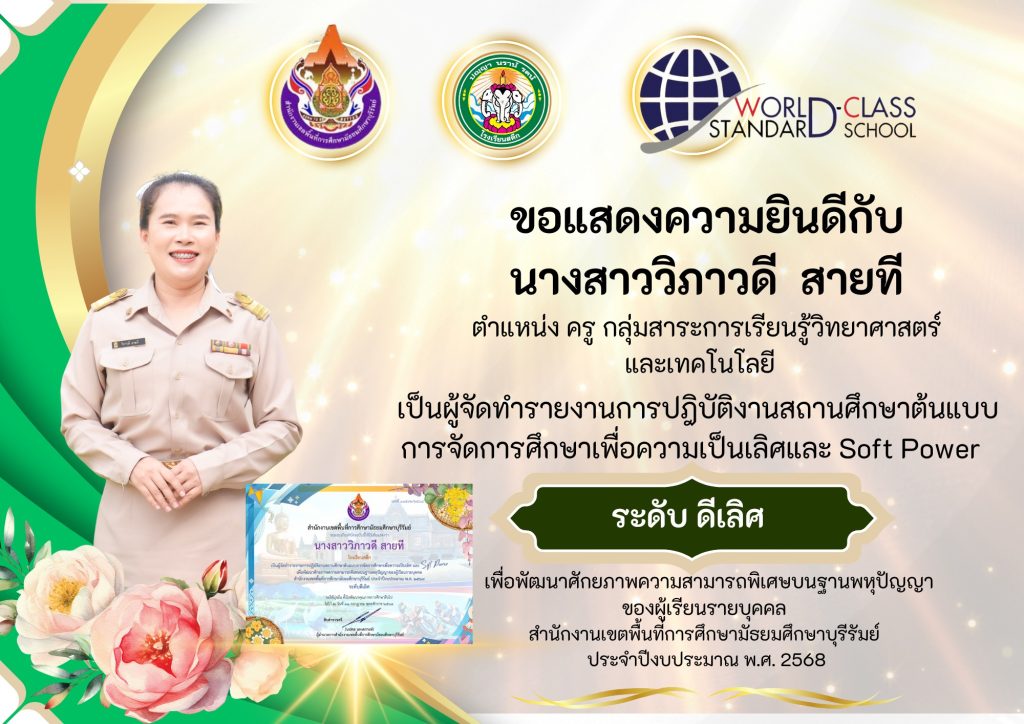 ขอแสดงความยินดีกับนางสาววิภาวดี สายที ตำแหน่ง ครู กลุ่มสาระการเรียนรู้วิทยาศาสตร์และเทคโนโลยี เป็นผู้จัดทำรายงานการปฎิบัติงานสถานศึกษาต้นแบบการจัดการศึกษาเพื่อความเป็นเลิศและ Soft Power เพื่อพัฒนาศักยภาพความสามารถพิเศษบนฐานพหุปัญญาของผู้เรียนรายบุคคล สำนักงานเขตพื้นที่การศึกษามัธยมศึกษาบุรีรัมย์ ประจำปีงบประมาณ พ.ศ. 2568 “ระดับ ดีเลิศ” ด้วยความยินดียิ่ง